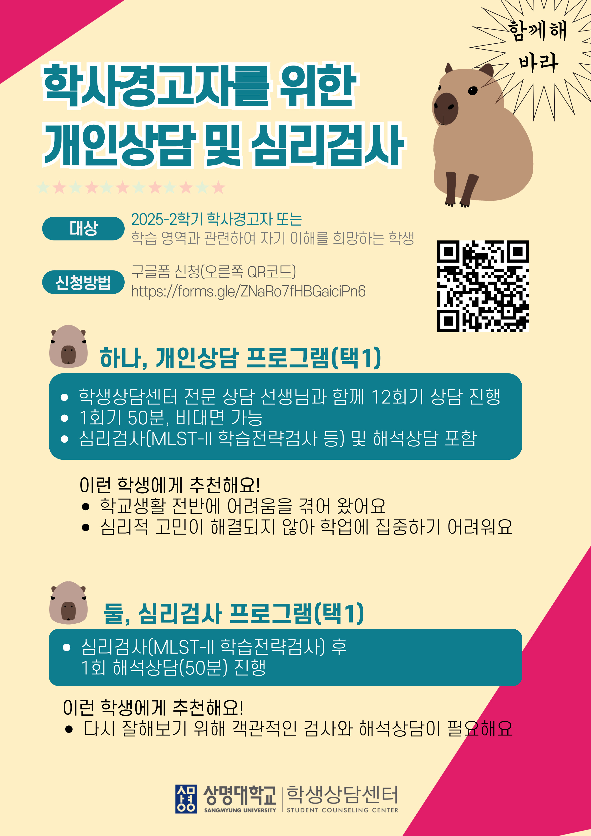 | 프로 그램 | 택1 | 학생상담센터 '개인상담 및 심리검사' | 방문상담 또는 비대면 (붙임 참조) | |